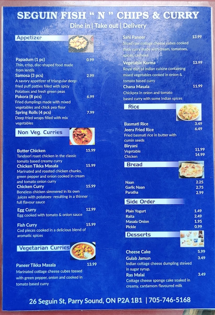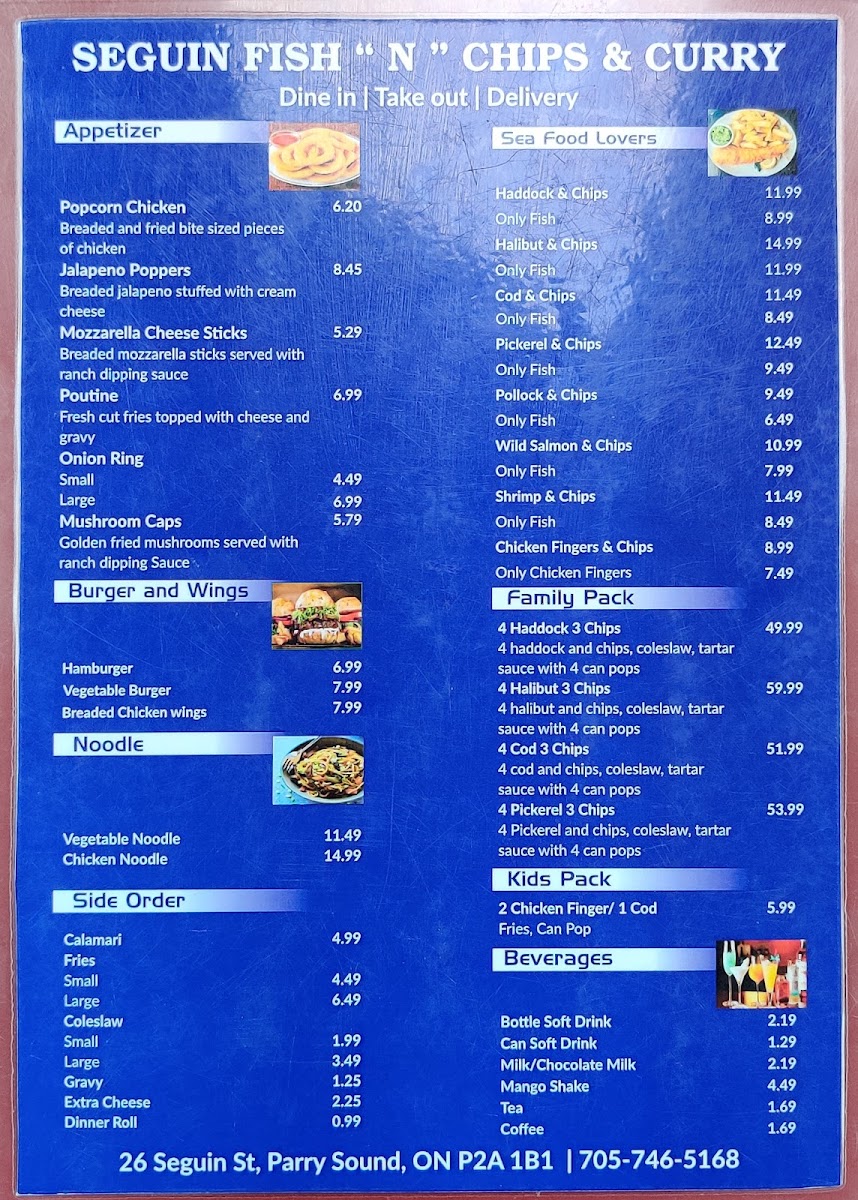 Welcome to Seguin Fish N Chips & Curry, a unique dining gem located at 26 Seguin St, Parry Sound. This restaurant beautifully marries traditional fish and chips with the vibrant flavors of Indian cuisine. The menu boasts a selection of irresistible seafood options, including the flaky halibut and crispy pickerel, both beloved by locals. Customers rave about generous portions, friendly service, and a warm atmosphere.